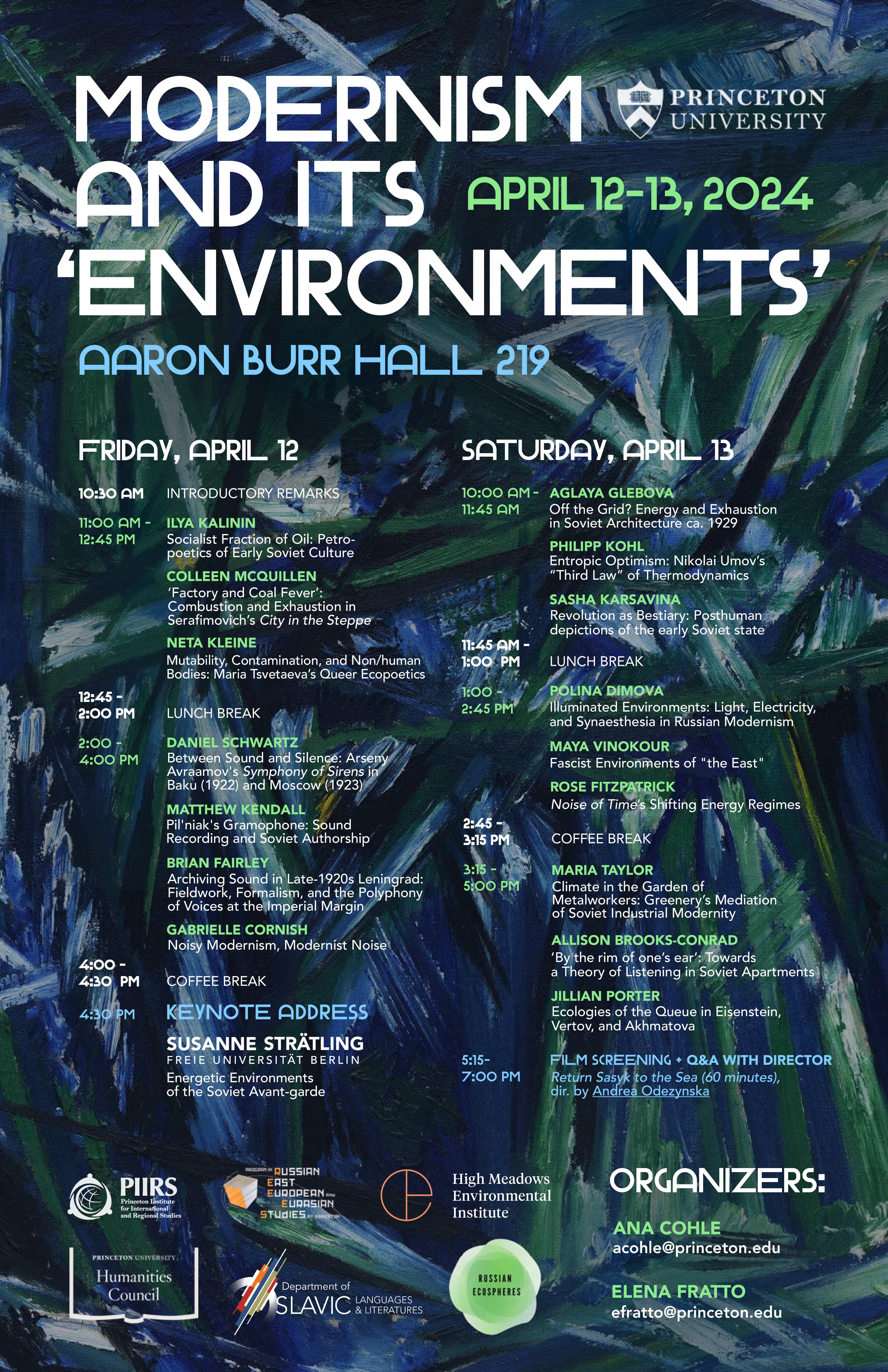 This two-day conference will revisit literary texts and cultural products of Russophone modernism and the avant-garde from an ecocritical perspective. The numerous discoveries in the fields of climatology, paleontology, physics, and biology that punctuated the early twentieth century brought about a new understanding of time, space, evolution, and the role of human life and activity vis-à-vis other living and nonliving entities. These new scientific ideas and technologies permeated modernist aesthetics, emerging thematically and stylistically throughout literature and the visual arts. Approaches include, but are not limited to, the energy humanities, extractive practices, and sound studies.